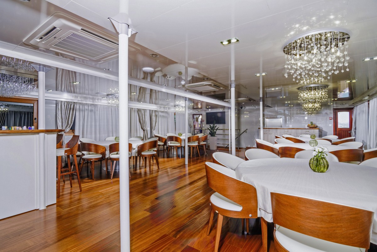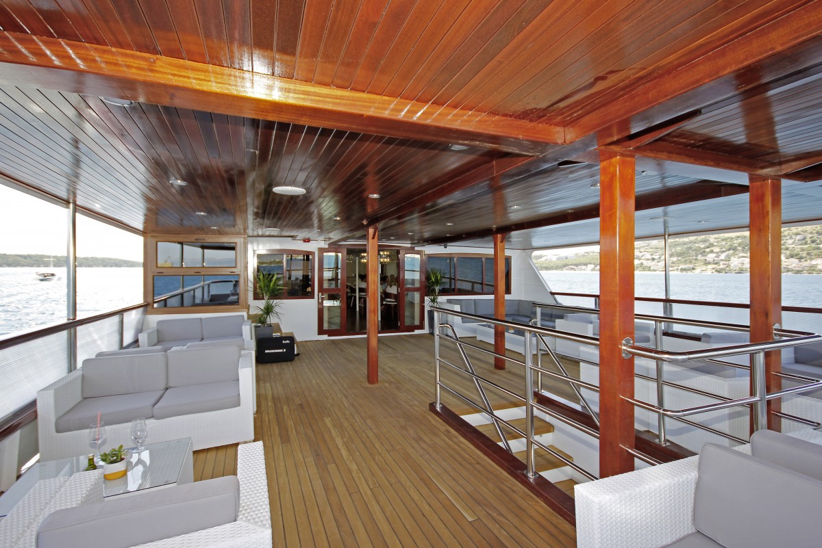 Sonstiges: Sonnendeck (220 m²) mit Sonnenliegen, Badeplattform mit Duschen am Heck. Salon mit Klimaanlage auf dem Oberdeck, gemütliche Sitzgruppen im Loungebereich auf dem überdachten Oberdeck hinter dem Salon, das witterungsabhängig mit Planen verschlossen werden kann. Tägliche Kabinenreinigung und Handtuchwechsel.
