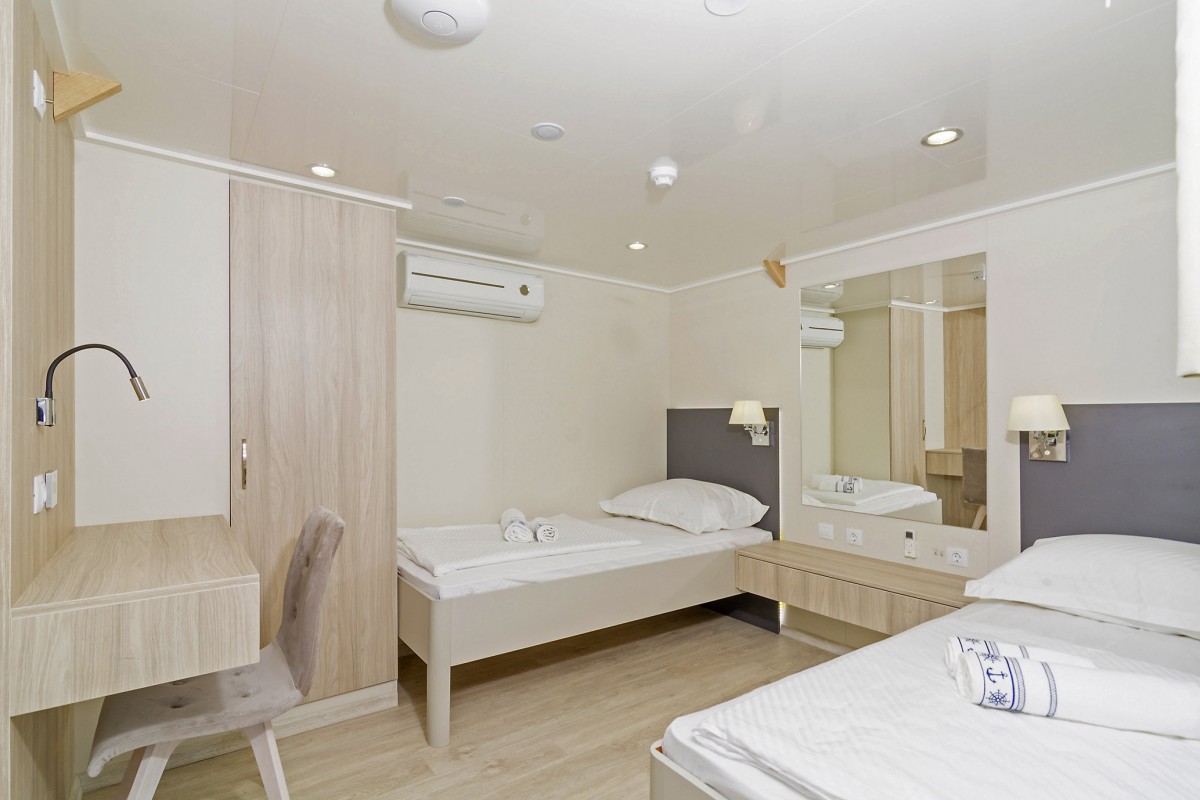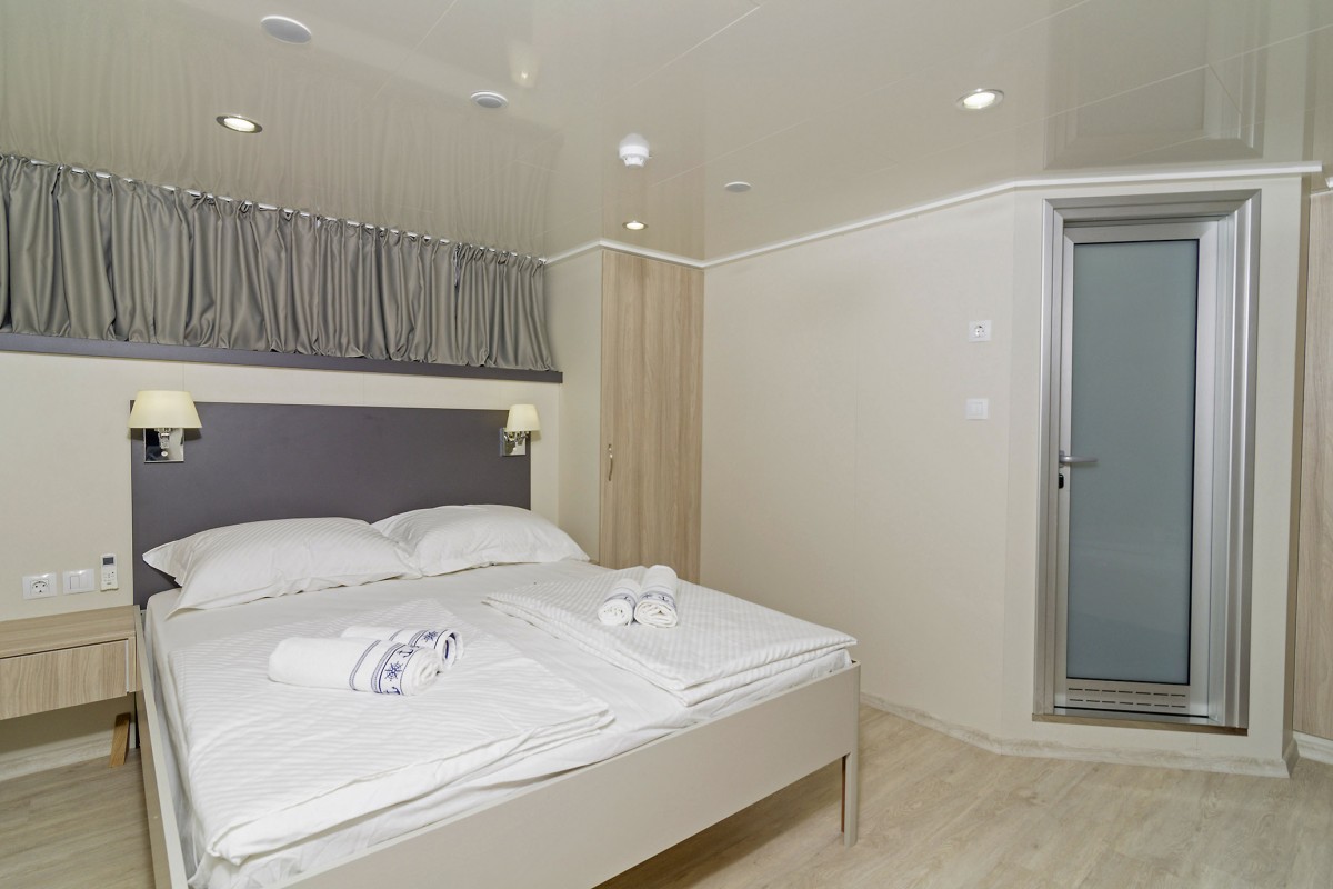 Hauptdeck: 6 Doppelkabinen mit Einzelbetten, 5 Doppelkabinen mit französischem Bett.